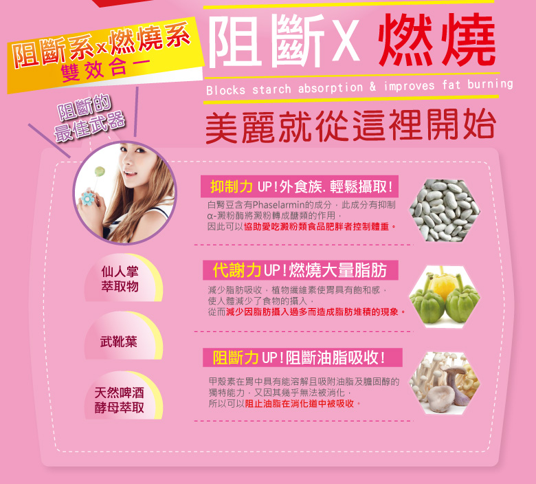 成 分:白腎豆萃取物、武靴葉萃取物、藤黃果萃取物、植物甲殼質(菇蕈來源)、紅花籽萃取物(含CLA共軛亞麻油酸)、啤酒酵母(含B群)、仙人掌萃取物、番紅花萃取物、二氧化矽、麥芽糊精