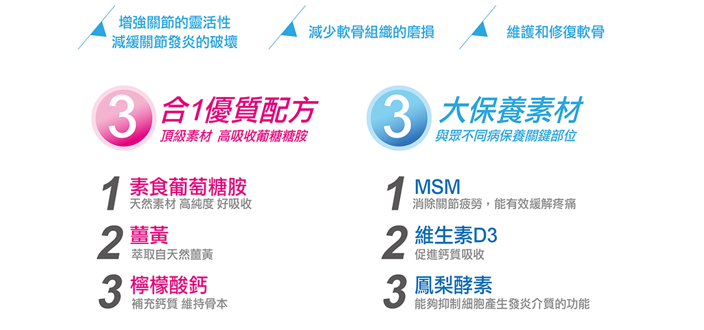 成 分:檸檬酸鈣、素食葡萄糖胺、馬尾草(含MSM)、鳳梨酵素、薑黃、貓山藤、維生素D3